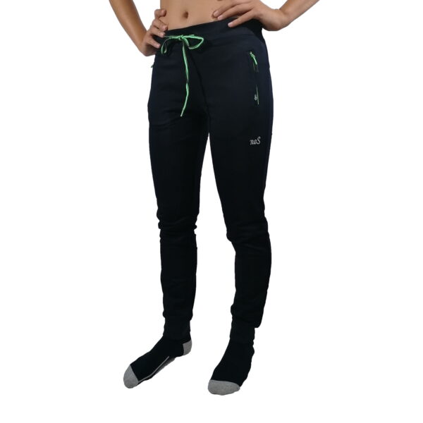 Women’s tracksuit for sports and spare time, black and blue with different color bands. The pockets are zipped. The elastic in the waist is 4 cm wide, it is stitched at the bottom edge, which prevents rotation. The pants are finished with a patent and the waist is classically high. Composition: 70% cotton, 20% polyester, 10% elastane.