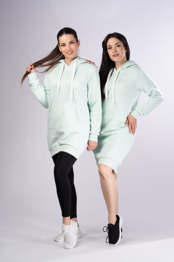Hoodie Mint je ženski sportski hoodie s kapuljačom. Pulover je iznutra podstavljen. Donji dio pulovera i rukavi završavaju patentom. S prednje strani ima klokanski džep i sjajni logo vez na prsima. U kapuljaču je uvučena srebrnobijela uzica.