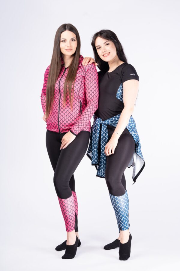 Dolge elastične pajkice z visokim pasom in ujemajočim vzorcem jopice in majice. Material ne vpija vlage in se hitro suši.